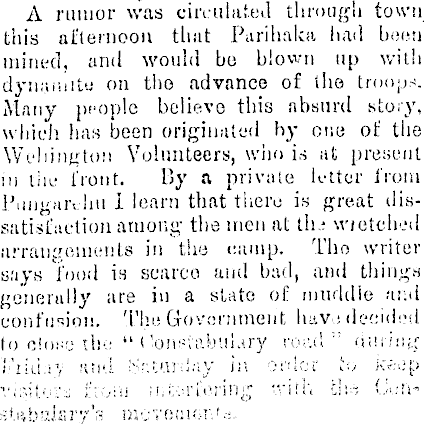A minor was circulated through town this afternoon that Parihaka had boon mined, and would be blown up with j dynamite on tho advance of the troops. S Many people believe this absurd story, I which has been originated hy one of the Wellington Volunteers, who is at present in the front. By a private kttor from Pungaivhu i learn that there is great dissatisfaction among - the men at th.; wjetch-'d arrangements in the camp. Tho writer , s.'iys food is scarce and bad, and thing.-) : k nrial!" w in a sUt" of mil [die i 1 to hj"ioi i I Gro i uncut li v d II t ) I (i ! i i I I