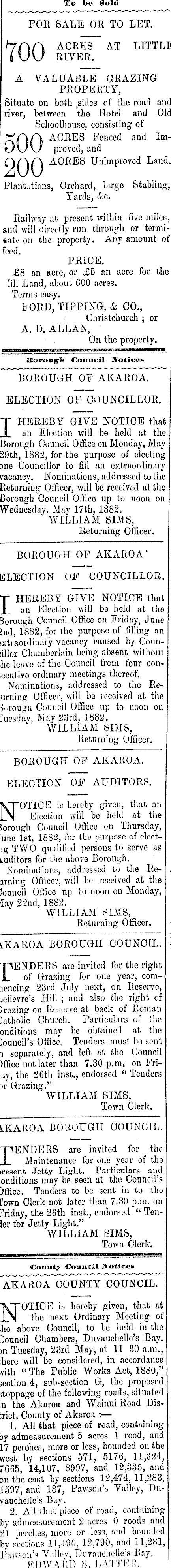 To I>« @ol<l FOR SALE OR TO LET. hAA ACRES AT LITTLIt I \J\J RIVER. A VALUABLE GRAZING PROPERTY, Situate on both jsides of the road and river, betwpen the Hotel and Old Schoolhouse, consisting of 5A A ACRES Fenced and Im\J\J proved, and QAA ACRES Unimproved Land. Plantations, Orchard, large Stabling, Yards, &c. Railway at present within five miles, and will directly run through or termitato on the property. Any amount of feed. PRICE. £8 an acre, or £5 an acre for the 'ill Land, about 600 acres. Terms easy. FORD, TIPPING, & CO., Christchurch ; or A.D.ALLAN, On the property. Borougrl'-' Council Notices BOROUGH OF AKAROA. ELECTION OF COUNCILLOR. I HEREBY GIVE NOTICE that an Election will be held at the Borough Council Office on Monday, May 29th, 1882, for the purpose of electing one Councillor to fill an extraordinary vacancy. Nominations, addressed to the Returning Officer, will be received at the Borough Council Office up to noon on Wednesday. May 17th, 1882. WILLIAM SIMS, Returning Officer. BOROUGH OF AKAROA * ELECTION OF COUNCILLOR. J HEREBY GIVE NOTICE that J_ an Election will be held at the Borough Council Office on Friday, June hid, 1882, for the purpose of filling an ■xtraordinary vacancy caused by Councilor Chamberlain being absent without he leave of tho Council from four coniecutive ordinary meetings thereof. Nominations, addressed to the Reurning Officer, will he received at the 3* .rough Council Office up to noon on Tuesday, May 23rd, 1882. WILLIAM SIMS, Returning Officer. BOROUGH OF AKAROA. ELECTION OF AUDITORS. KTOTICE is hereby given, that an |_\| Election will be held at the sorough Council Office on Thursday, une Ist, 1882, for the purpose of electlg TWO qualified persons to serve as Luditors for the above Borough. Nominations, addressed to the Reaming Officer, will he received at the Council Office up to noon on Monday, lay 22nd, 1882. WLLLIAM SIMS, Returning Officer. LKAROA BOROUGH COUNCIL. rENDERS are invited for the right of Grazing for one year, comlencing 23rd July next, on Reserve, jelievre's Hill ; and also the right of Jrazing on Reserve at back of Roman "atholic Church. Particulars of the onditions may he obtained at the Council's Office. Tenders must be sent i separately, and left at the Council )ffice not later than 7.30 p.m. on Friay, the 26th inst,, endorsed " Tenders sr Grazing." WILLIAM SIMS, Town Clerk. AKAROA BOROUGH COQNCIL. rENDERS are invited for the Maintenance for one year of the iresent Jetty Light. Particulars and onditions may be seen at the Council's )ffice. Tenders to be sent in to the [own Clerk not later than 7.3t) p.m. on Friday, the 26th inst., endorsed " Tenler for Jetty Light." WILLIAM SIMS, Town Clerk. MHITOHHTW"™ '""HI 1111111111111 ir' 1 *"" 1 IrW ""—"t Comity Council Notices AKAROA COUNTY COUNCIL. "VTOTICE is hereby given, that at J_NJ the next Ordinary Meeting of ,he above Council, to he held in the Council Chambers, Duvauchelle's Bay. m Tuesday, 23rd May, at 11 30 a.m., ihere -will be considered, in accordance ■vith " The Public Works Act, 1880," section 4, sub-section G, the proposed stoppage of the following roads, situated n the Akaroa and Wainui Road District. County of Akaroa :— 1. All that piece of road, containing by admeasurement 5 acres 1 rood, and 17 perches, more or less, hounded on the svest by sections 571, 5176, 11,324, 7665, 14,107, 8997, and 12,335, and Dn the east by sections 12,474, 11,283, 1597, and 187, Pawson's Valley, Duvauchelle's Bay. 2. All that piece of road, containing by admeasurement 2 acres 0 roods and 2J perches, more or less, and bounded by sections 11,490, 12,790, and 11,281, Pawson's Valley, Dnvauchelle's Bay, FDWAKD H. LATTRK.
