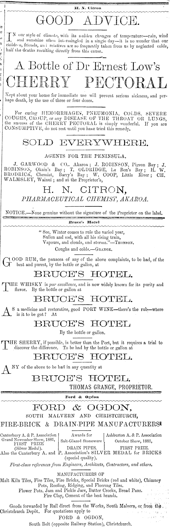 ' M.. N. Citron ~ ". le IN our style of climate, with its sudden changes of temperature—rain, wind and sunshine often intermingled in a single clay—it is no wonder that our childtvu, friends, and relatives are so frequently taken from us by neglected colds, ■'> half tho deaths resulting directly from this cause. _ A Bottle of Dr Ernest Low's i CHERRY PECTORAL Kept about your house for immediate use will prevent serious sickness, and per- ■ haps death, by the use of three or four doses. ■j For curing HEMORRHAGED, PNEUMONIA, COLDS. SEVERE COUGHS, CROUP, or any DISEASE OF THE THROAT OR LUNGS, the success of the CHERRY PECTORAL is simply wonderful. If you are CONSUMPTIVE, do not rest until you have tried this remedy. [ SOLD EVERYWHERE. ! AGENTS FOR THE PENINSULA. J. GARWOOD & CO.. Akaroa ; J. ROBINSON, Pigeon Bay; J. ROBINSON, Okain's Bay; T. OLDRIDGE, Le Bon's Bay; H. W. BRODRICK, Chemist, Barry's Bay ; W. COOP, Little River; CH. WALMSLEY, Wainui ; and at the Proprietor's, H. N. CITRON, PHARMACEUTICAL CHEMIST, AKAROA. NOTICE.—None genuine without the signature of the Proprietor on the label. J3Ei*»i9:<u'i* SSwtel " See, Winter comes to rule the varied year, Sullen and sad, with all his rising train, Vapours, and clouds, and storms."—Thomson. Coughs and colds.—Grange. aOOD RUM, the panacea of any of the above complaints, to be had, of the best and purest, by the bottle or gallon, at BRTJOE'S HOTEL. THE WHISKY is par excellence, and is now widely known for its purity and flavor. By the bottle or gallon at BRTJOE'S HOTEL. AS a medicine and restorative, good PORT WlNE—there's the rub—where is it to be got ? At BRTJOE'S HOTEL By the bottle or gallon. TIIE SHERRY, if possible, is better than the Tort, but it requires a trial to discover the difference. To be had by the bottle or gallon at BRTJOE'S HOTEL. A NY of the aboye to be had in any quantity at BRTJOE'S HOTEL. THOMAS GRANGE, PROPRIETOR. ford «Sc Og'don SOUTH MALVERN AND CHRISTCHURCH, FIRE-BRICK & DRAIN-PIPE MANUFACTURERS* Canterbury A. & P. Association Awards for Ashburton A. & P. Association Grand November Show, 1881, Salt-Grlaze*i Stoneware October Show, 1881, FIRST PRIZE (Silver Medal). DRAIN PIPES. FIRST PRIZE. Also the Canterbury A. and P. Association's SILVER MEDAL for BRICKS (special quality). Fi7-st-class references from Engineers, Architects, Contractors, and others. MANUFACTURERS OF Malt Kiln Tiles, Fire Tiles, Fire Bricks, Special Bricks (red and white), Chimney Pots, Roofing, Ridging, and Flooring Tiles. Flower Pots. Jam and Pickle Jars, Butter Crocks, Bread Pans. ' Fire Clay, Cement of the best brands. : Goods forwarded by Rail direct from the Works, South Malvern, or, from tliq , , Christchurch Depot. For quotations apply to ■.•■■.■ -A. ■•■ FORD & OGDON, South Belt (opposite Railway Station), Christchurch.