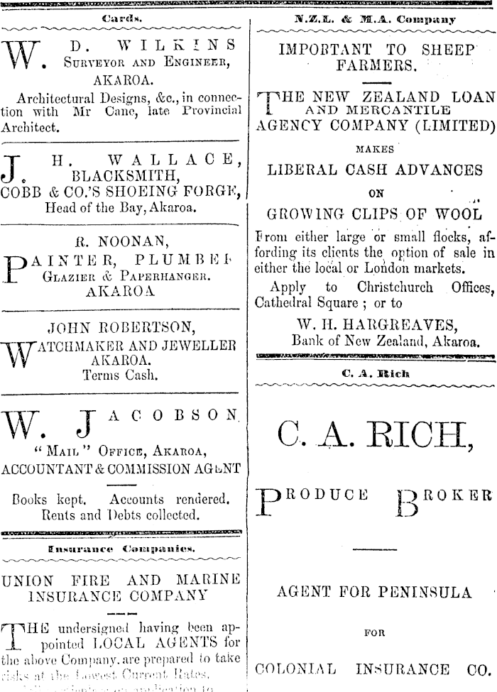 Card-*. W.2!!..'1L. & M.A. Coibiii»u.t WD. WILKINS IMPORTANT TO SHEEP , Surveyor and Engineer, FARMERS. : AKAROA. Architectural Designs, &c., in connec- HHHE NEW ZEALAND LOAN tion with Mr Cane, late Frovincial 1 AND MERCANTILE Architect. AGENCY COMPANY (LIMITED) ' ~ — ~ ~ MAKES ' J c H BLACKSMITH, A° E ' LIBERAL CASH ADVANCES COBB & CO.'S SHOEING FORGE, | on Head of the Bay, Akaroa. GROWING CLIPS OF WOOL R NOONAN Drom either large or small flocks, afPA INT F R PLUMB E b or^n ß lts d} Qnts the option of sale in ~ x „' -p. J either the local or London markets. Glazier i\s Paperhanger. AKAROA Apply to Christchurch Offices, Cathedral Square ; or to JOHN ROBERTSON, W. H. HARGREAVES, TTTATCHMAKER AND JEWELLER Bank of New Zealand, Akaroa. Terms Cash. c a. Rich WTACOBSON. • J A C. A. EIOH, •*' Mail ' Office, Akaroa, ? ACCOUNTANT & COMMISSION AGbNT Books kept. Accounts rendered. T)RODUCE OROKER Rents and Debts collected. -*- -A—-*- 1 ffn.*ui-iiii**<' Companfe*-). UNION FIRE AND MARINE INSURANCE COMPANY AGENT FOR PENINSULA ■ THE undersigned having been ap- FOR pointed LOCAL AGENTS for the above Comnanv. are prepared io take ,\XTZ xh i A'Z Current Rates. COLONIAL INSURANCE CO.