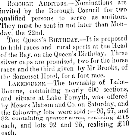 Bououaii Auditors.—Nominations are invited by the Borough Council to two qualified persons to serve as auditors. They must be sent in not later than Monday, the 22nd. The Queen's Birthday.—lt is proposed to hold races nnd rural sports at the Head of the Bay. on the Queen's Birthday. Three silver cups are promised, two for the horse races and the third given by Mr Brooks, of the Somerset Hotel, for a foot race. Lakebouhne—The township of LakeBourne, containing nearly GOO sections, and situate at Lake Forsyth, was offered by Messrs Matson and Co. on Saturday, and the following lots were sold :—96, 97, and 82, containing- quarter aures, realising iils each, and lots 92 and 95, realising £10 each.