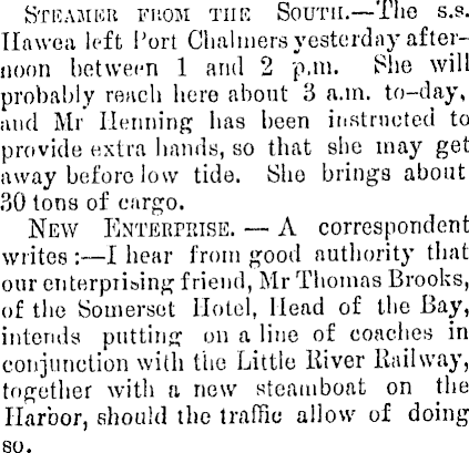 Steamer from tiie South.—The s.s. Tlawea left l'ort Chalmers yesterday afternoon between 1 arid 2 p.m. She will probably reach here about 3 a.m. to-day, and Mr' Henning has been instructed to provide extra hands, so that she may get away before low tide. She brings about 30 tons of cargo. New Enterprise. — A correspondent writes :—I hear from good authority that our enterprising friend, Mr Thomas Brooks, of the Somerset Hotel, Head of the Bay, intends putting on a line of coaches in conjunction with the Little River Railway, together with a new steamboat on the Harbor, should the traffic allow of doing 80.