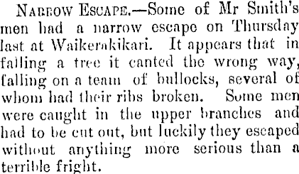 Nabeow Escape,—Some of Mr Smith s men bad a narrow escape on Thursday last, at Waikerakikari. It appears that in falling a tree it canted the wrong way, falling on a team of bullocks, several of whom had their ribs broken. Some men were caught in the upper branches and had to be cut out, but luckily they escaped without anything more serious than a terrible fright