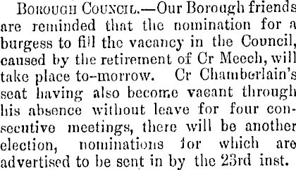 Bokough Council.—Our Borough friends are reminded that the nomination for a burgess to fill the vacancy in the Council, caused by the retirement of Cr Meech, will take place to-morrow. Cr Chamberlain's seat having also become vacant through his absence without leave for four consecutive meetings, there will be another election, nominations Jor which are advertised to be sent in by the 23rd inst.