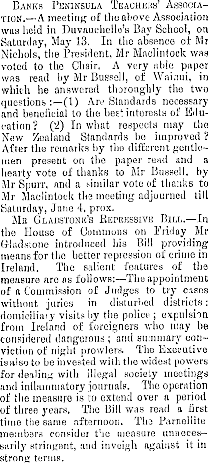Banks Peninsula Teachers' Association. —A meeting of the above Association was held in Duvauchelle's Bay School, on Saturday, May 13. In the absence of Mr Nichols, the President, Mr Maelintock was voted to the Chair. A very able paper was read by Mr Bussell, of Wainui, in which he answered thoroughly tho two questions :—(1) Are Standards necessary and beneficial to the best interests of Education ? (2) In what respects may tho New Zealand Standards be improved ? After tbe remarks by the different gentlemen present on the paper read and a hearty vote of thanks to Mr Bussell. by Mr Spurr, and a similar vote of thanks to Mr Maelintock the meeting adjourned till Saturday, June 4. prox. Mr Gladstone's Repressive Bill.—ln the House of Commons on Friday Mr Gladstone introduced his Bill providing means for tho better repression of crime in Ireland. The salient features of the measure aro as follows:—The appointment of a Commission of Judges to try cases without juries in disturbed districts: domiciliaiy visits by the police ; expulsion from Ireland of foreigners who may be considered dangerous; and summary conviction of night prowlers. The Executive is also to be invested wiih the widest powers for dealing with illegal society meetings and inflammatory journal?. The operation of the measure is to extend over a period of three years. The Bill was read a first time the same afternoon. The Parnellite members consider the measure unnecessarily stringent, and inveigh against it in strong terms.