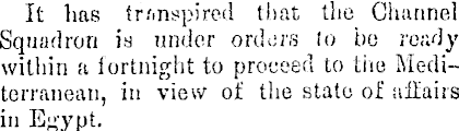 It has tr.'inspired that the Channel Squadron is under orders lo bo ready within a fortnight to proceed to tho Mediterranean, in view of the state of affairs in Egypt