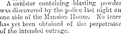 A canister containing blasting powder was discovered by the police last night on one side of the Mansion House. No trace has yet been obtained of tho perpetrator of the intended outrage.