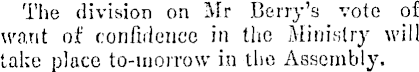 The division on Mr Berry's vote of want of confidence in the Ministry will take place to-morrow in the Assembly.