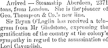 Arrived —■ Steamship Aberdeen, 2371 tons, from London. She is the'pioneer of Geo. Thompson & Co.'s new lino. Sir Bryan O'Loglin has received a telegram from Mr Gladstone, expressing the gratification of the country at the colony's sympathy in regard to the assassination of Lord Cavendish.