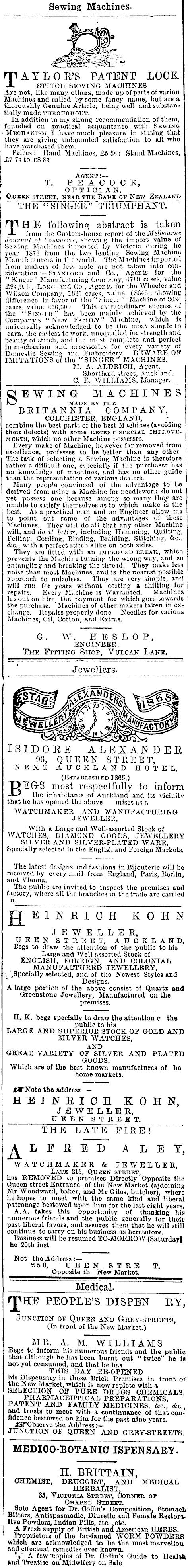 Sewing Machines. TATLOE'S PATENT LOOK STITCH SEWING MACHINES Are not, like many others, made up of parts of variou Machines and called by some fancy name, but are a thoroughly Genuine Article, being well and substantially made tixiioucsiiout. In addition to my strong recommendation of them, founded on practical acquantance with Sewing • MucnANissr, I have much plensure in stating that they are giving unbounded satisfaction to all who have purchased them. Prices : - Hand Machines, £5 ss; Stand Machines, £7 7s to £8 Ss, Acieot:— T. PEACOCK, , OPTICIAN, , QtJKTCN STREET. NEAR TDK BANK OF NEW ZEALAND THE "SINGER" TRIUMPHANT. TH E following abstract is taken from the Custom-house report of the Melbourne Journal of Commerce, ghowirg the import value of Sewing Machines imported by Victoria during he year 1872 from tho two leading Sewing Machine Mivnnfaclurcr.s in the world. The Machines imported from makers of less note are not taken into consideration :—Stanvon« and Co., Agents for the "Singer" Manufacturing Company, 4710 cases, value £24,955 ; Loxfi and Co , Agents for the Wheeler and Wilson Company, 1G35 cases, value .-EBG4G ; showing difference in favor of the " binger" Machine of 3084 cases, value £10,300 This extraordinary success of the "SiNOiieit" has been mainly achieved by the Company's "Nkw Family" Machine, which is universally acknowledged to be the most simple to earn, the easiest to work, unequalled for strength and beauty of stitch, and the most complete and perfect in mechanism and accessories for every variety of Domestic Sewing and Embroidery. BEWARE OF IMITATIONS of the "SINGER" MACHINES. M. A. ALDRICII, Agent, Shorthand street, Auckland. C. E. WILLIAMS, Manager. SEWING MACHINES MADE BY THE BRITANNIA COMPANY, COLCHESTER, ENGLAND, combine the best parts of the best Machines (avoiding their defects) with some recent special improvements, which no other Machine possesses. Every make of Machine, however far removed from excellence, professes to be better than any other. The task of selecting a Sewing Machine is therefore rather a difficult one, especially if the purchaser has , no knowledge of machines, and has no other guide than the representation of various dealers. Many people convinced of the advantage to be derived from using a Machine for needlework do not ! yet possess one because among so many they are unable to satisfy themselves as to which make is the best. As a practical man and an Engineer allow ma to point out some of the advantages of these Machines. They will do all that any other Machine will, and do it letter, including Hemming, Quilting, Felling, Cording, Binding, Braiding. Stitching, &c, &c, with a perfect stitch alike on both sides. They are fitted with an IMPROVED break, which prevents the Machine turning the wrong way, and so entangling and breaking the thread. They make less noise than most Machines, and is the nearest possible approacli to noiseless. They are very simple, and will run for years without costing a shilling for repairs. Every Machine is Warranted. Machines let out on hire, the payment for which goes towards the purchase. Machines of other makers taken in exchange. Repairs properly done. Needles for various Machines, Oil, Cotton, and Extras. G. W. HESLOP, engineer, The Fitting Shop, Vulcan Lake. JewellersISIDORE ALEXANDER 9G, QUEEN STREET, NEXT AUCKLAND HOTEL, (Established J865,) BEGS most respectfully to inform the inhabitants of Auckland' and its vicinity that ho has opened the above miscs as a WATCHMAKER AND MANUFACTURING JEWELLER, With a Large and Well-assorted Stock of WATCHES, DIAMOND GOODS, JEWELLERY SILVER AND SILVER-PLATED WARE, Specially selected in the English and Foreign Markets. The latest designs and fashions in Bijouterie will bo received by every mail from England, Paris, Berlin, and Vienna. The public are invited to inspect the premises and factory, where all the branches in the trade are carried n. gEIK RI C H KOHN JEWELLER, UEEN STREET, AUCKLAND, Begs to diaw the attention of tho public to his Large and AVell-assorted Stock of ENGLISH. FOREIGN, AND COLONIAL MANUFACTURED JEWELLERY, • selected, and of tho Newest Styles and Designs. A large portion of the above consist of Quartz and Greenstone Jewellery, Manufactured on the premises. H. K. begs specially to draw the attention c the public to his LARGE AND SUPERIOR STOCK OF GOLD AND SILVER WATCHES, AND GREAT VARIETY OF SILVER AND PLATED GOODS, Which are of the best known manufactures of he home markets. jtSTNote the address — HBINEICH KOHN, JjSWELLER, ueen street. THE LATE FIRE! " J^ L F R E D A L E T, WATCHMAKER & JEWELLER, Late 215, Qubxn street, has REMOVED co premises Directly Opposite the Queen street Entrance of the Now Market (ajdoining Mr Woodward, baker, and Mr Giles, butcher), where he hopes to meet with the same kind and liberal patronage bestowed upon him for the last eight years. A. A. takes this opportunity of thanking hip numerous friends and the public generally for their past liberal favors, and assures them that he will still continue to carry on his business as heretofore. Business will be resumed TO-MORROW (Saturday! he 20th inst Not the Address :— 26 0, UEEN STRB T, Opposite th New Market. Medical. rjTßffi PEOPLE'S DISPEN RY, Junction of Queen and Grey-streets, (In front of the New Market.) MR. A. M. WILLIAMS Begs to inform his numerous friends and the public that although he has been burnt out " twice" he is not yot consumed, and that he has THIS DAY RE-OPENRD his Dispensary in those Brick Premises in front of the X ew Market, which is now replete with a SELECTION OF PURE DRUGS CHEMICALS, PHARMACEUTICAL PREPARATIONS, PATENT AND FAMILY MEDICINES, &c, &c., and trusts to meet with a continuance of that confidence bestowed on him for the past nine years. itarObserve the Address :— JUNCTION OF QUEEN AND GREY-STREETS. MEDICO-BOTANIC ISPENSARY. H. BRITTAIN, CHEMIST, DRUGGIST, AND MEDICAL HERBALIST, 66, Victoria Street, Corner or Chapel Stree