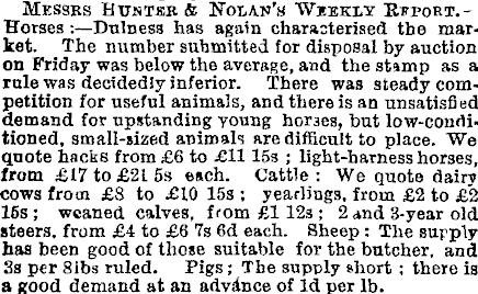 Messbs B tjnteb _ Nolan's Weekly Report.Horses: —Dulness has again characterised the market. The number suhmitted for disposal by auction on Friday was below the average, and the stamp as a rule was decidedly inferior. There was steady competition for useful animals, and there is an unsatisfied demand for upstanding young horses, but low-condi-tioned, small-sized animals are difficult to place. We quote hacks from £6 to £1115s ; light-harness horses, from £17 to £21 5s each. Cattle :We quote dairy cows from £8 to £10 15s ; yearlings, from £2 to £_ 16s ; weaned calves, from £112s ; 2 and 3-year old steers, from £4 to £6 7s 6d each. Sheep : The supply has been good of those suitable for the butcher, and 3s per 81bs ruled. Pigs; The supply short ; there is a good demand at an advance of Id per lb.