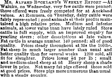 Mb. A_fb_d BrroKLAND's "Weekly Report —At Wainku, on Wednesday, very few cattle were penned; those offered were freely competed for at Auckland values. At Remuera. on Thursday, dairy cattle were fairly repre?ented ; good animals at their profits maintained a high relative price. Medium and inferior animals, at lower value than have lately ruled. Store cattle in full supply, with an improved enqui'y for. yearling steers ; other descriptions at late values. Fat cattle in average number. 140 penned: all of good quality. Prices steady throughout at 35s the 1001b«. Fat sheep in much larger number than usual and better quality than for several weeks. 1200 sold, all fit for slaughter. Prices lower _d per lb ; small and medium-sized sheep at 4d. Heavy sheep a shade lower in price. Not many fat pigs offered, those sold at good prices. Store pigs more numerous than usual with a steady eriquiry.
