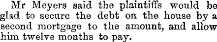 . Mr Meyers said the plaintiffs would be glad to secure the debt on the house by a second mortgage to the amount, and allow him twelve months to pay.
