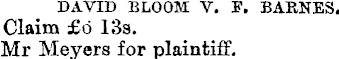 DAVID BLOOM V. P. BARNES. Claim £6 13s. Mr Meyers for plaintiff.
