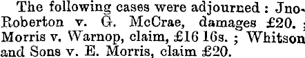 The following cases were adjourned : JnoRoberton v. G. McCrae, damages £20. ; Morris v. Warnop, claim, £16 16s. ; Whitson and Sons v. E. Morris, claim £20.