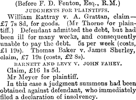 (Before F. D. Fenton, Esq., KM.) JUDGMENTS TOR PLAINTIFFS. William Rattray v. A. Grattan, claim— £7 7s Bd, for goods. (Mr Thorne for plaintiff.) Defendant admitted the debt, but had been ill for many weeks, and consequently unable to pay the debt. 5s per week (costs, £1 19s). Thomas Baker v. James Sherley, claim, £7 19s (costs, £2 8s). BAKNETT AND LEVY V. JOHN PAHEY. Claim, £16 Is sd. Mr Meyer for plaintiff. In this case a judgment summons had been obtained against defendant, who immediately filed a declaration of insolvency.
