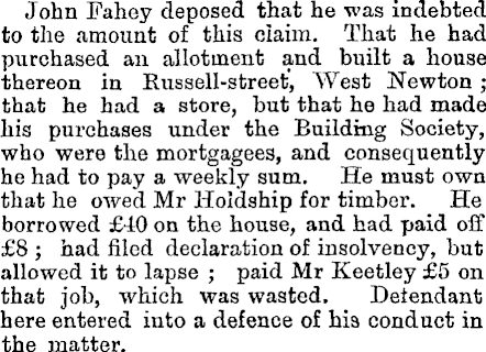 John Fahey deposed that he was indebted to the amount of this claim. That he had purchased an allotment and built a house thereon in Russell-street, West Newton; that he had a store, but that he had made his purchases under the Building Society, who were the mortgagees, and consequently he had to pay a weekly sum. He must own that he owed Mr Hoidship for timber. He borrowed £40 on the house, and had paid off £8 ; had filed declaration of insolvency, but allowed it to lapse ; paid Mr Keetley £5 on that job, which was wasted. Defendant here entered into a defence of his conduct in the matter.