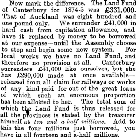 Now mark the difference. The Land Fund of Canterbury for 1574-5 was £331,000. That of Auckland wa3 eight hundred and one pound only. We surrender £41,000 in hard cash from capitation allowance, and have it replaced by money to be borrowed at our expense—until the Assembly choose to stop and begin some new system. For local works we have no Land Fund, and therefore no provision at all. Canterbury surrenders £41,000 like ourselves, but she has £290,000 made ab once available— released from all claim for railways or works of any kind paid for out of the great loans of which such an enormous proportion has been allotted to her. The total sum of which the Land Fund is thus released for all the provinces is stated by the treasurer himself at ten and a half millions. Add to this the four millions just borrowed, you have in all fourteen and a-half millions.