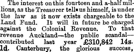 The interest on this fourteen and a-half millions, as the Treasurer tellaus himself, is under the law as it now exists chargeable to the Land Fund. It will in future be charged against the Colonial Kevenue. To that revenue Auckland—the public scandal— contributed last year £310,842 14s. Id. Canterbury, the glorious success,
