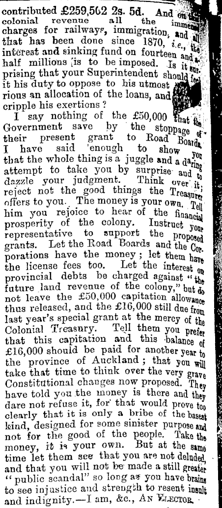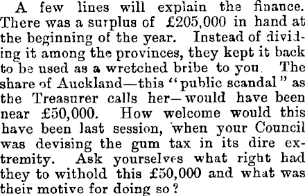A few lines will explain the finance. There was a surplus of £205,000 in hand at the beginning of the year. Instead of dividing it among the provinces, they kept it back to be used as a wretched bribe to you. The share of Auckland—this "public scandal" as the Treasurer calls her—would have been near £50,000. How welcome would this have been last session, when your Council was devising the gum tax in its dire extremity. Ask yourselves what right had they to withold this £50,000 and what was their motive for doing so ?