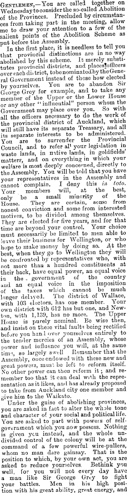 Gentlemen- You are called together on Wednesday to consider the so-called Abolition of the Provinces. Precluded by circumstances from taking part- in the meeting, allow me to draw your attention to a few ot the salient points of the Abolition Scheme as put before the Assembly. In the first place* it is needless to tell you that provincial distinctions are in no way abolished by this scheme. It merely substitutes provincial districts, and plaeesTofficers over each district, tobenominatedlby the General Government instead of those how elected by yourselves. You are to abandon Sir George Grey for example, and to take any member of the Upper or the Lower House or any other " influential" person whom the Government may place over you. So with all the officers necessary to do the work of the provincial district of Auckland, which will still have its separate Treasary, and all its separate interests to be administered. You are to surrender the Provincial Council, and to refer al 1 your legislation in waste lands, in native lands, in goldfields matters, and on everything in Which your welfare is most deeply concerned, directly to the Assembly. You will be told that you have your representatives in the Assembly and cannot complain. I deny this in toto. Your members will, at the best, only be a small minority of the House. They are certain, souse from Honest conviction and some from interested motives, to be divided among themselves. They are elected for five years, and for that time are beyond your control. Your choice must necessarily be limited to men able to [cave their business for Wellington, or who hope to make money by doing so. At the best, when they go to Wellington they will be confronted by representatives who, with not more than a hundred constituents at their back, have equal power, an equal Voice ia the - government of the country and an equal voice in the imposition of the taxes which cannot be much longer delayed. The district of Wallace, with 103 electors, has one member. Your own district with Gl2 has but one, and Newton, with 1,139, has no more. The Upper House is purely nominal. Be wise then, and insist on these vital faults being rectified before you ban! over yourselves entirely to the tender mercies of an Assembly, whose power aud influence you will, at the same time, so largely swell Remember that the Assembly, ouce endowed with these new and great powers, mus' be left to reform itself. No other power can thcD reform it; and remember too that it can deal wiAh the representation as it likes, and has already proposed to take from Auckland city one member and give him to the Waikato. Under the guise of abolishing provinces, you are asked in fact to alter the whale tone and character of your social and political life. You are asked to part with powers of selfgovernment which you now possess. Nothing is given ycu instead, and the whole undivided control of the colony will be at the command of a fow powerful wire-pullers, whom no man dare gainsay. That is the position to which, by your own act, you are asked to reduce yourselves. Bethink you well, for you will not every day have a man like Sir George Grey to fight your battles. Men in his high position with his great ability, great energy, and