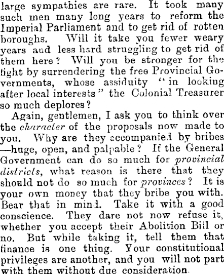 large sympathies are rare. It took many such men many long years to reform the Imperial Parliament and to get rid of rotten boroughs. Will it take you fewer weary years and less hard struggling to get rid of them here ? Will you be stronger for the tight by surrendering the free Provincial Governments, whose assiduity "in looking after local interests " the Colonial Treasurer so much deplores ? Again, gentlemen, I ask you to think over the character of the proposals now made to you. Why are they accompanied by bribes —huge, open, and palpable ? It the General Government can do so much for provincial districts, what reason is there that they should not do so much for provinces 1 It is your own money that they bribe you with. Bear that in mini. Take it with a good conscience. They dare not now refuse it, whether you accept their Abolition Bill or no. But while taking it, tell them that finance is one thing. Your constitutional privileges are another, and you will not part with them without due consideration.
