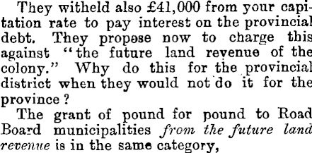 They witheld also £41,000 from your capitation rate to pay interest on the provincial debt. They propase now to charge this against "the future land revenue of the colony." Why do this for the provincial district when they would not do it for the province ? The grant of pound for pound to Road Board municipalities from the future land revenue is in the same category,