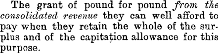 The grant of pound for pound from the consolidated revenue they can well afford to pay when they retain the whole of the surplus and of the capitation allowance for this purpose.