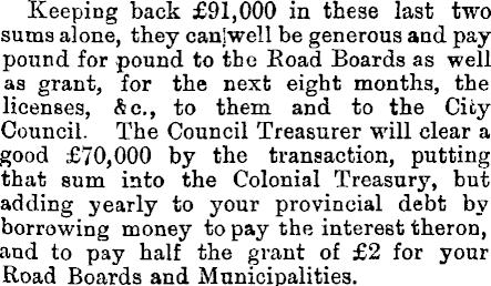 Keeping back £91,000 in these last two sums alone, they canlwell be generous and pay pound for pound to the Koad Boards as well as grant, for the next eight months, the licenses, Ac, to them and to the City Council. The Council Treasurer will clear a good £70,000 by the transaction, putting that sum into the Colonial Treasury, but adding yearly to your provincial debt by borrowing money to pay the interest theron, and to pay half the grant of £2 for your Road Boards and Municipalities.
