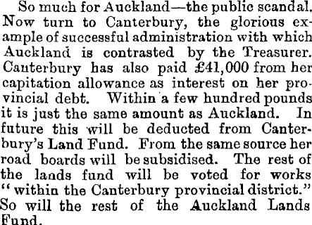 So much for Auckland—the public scandal. Now turn to Canterbury, the glorious example of successful administration with which Auckland is contrasted by the Treasurer. Canterbury has also paid £41,000 from her capitation allowance as interest on her provincial debt. Within a few hundred pounds it is just the same amount as Auckland. In future this will be deducted from Canterbury's Land Fund. From the same source her road boards will be subsidised. The rest of the lands fund will be voted for works " within the Canterbury provincial district." So will the rest of the Auckland Lands Fund.
