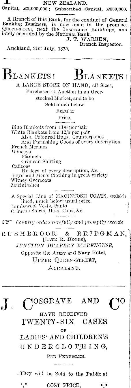 -L NEW ZEALAND. Capital, £2,000,000; Subscribed Capital, £850,000. A Branch of this Bank, for the conduct of General Banking Business, is now open in the premises Qneen-streei. next the Insurance Buildings, and lately occupied by the National Bank. J. T. WAJJREISr, Branch Inspector. Auckland, 21st July, 1875. LANKETS! JDLAJNKETS ! A LARGE STOCK ON HAND, all Sizes, Purchased at Auction in an Overstocked Market, and to be Sold much below Regular Price. Blue Blankets from 11/0' per pair White Blankets from 12/0 per pair Also, Coloured Rug's, Counterpanes And Furnishing' Goods of every description French Merinos Winceys Flannels Crimean Shirting Calicoes ' Hosiery of every description, &c. Bnys' and Men's Clothing ill great variety j Witney Overcoats i Macintoshes A Special Line of MACINTOSH COATS, scalskil I lined, much below usual price. Lambswool Vests, Pants " I Crimean Shirts, Hats, Caps, &c. KW~ Covntiy orders carefully and promptly execute. ; . RUSHEPvOOK & BRIDGMAN,' [Latk R. Hobbs], JUNCTION DRAPERY WAREHOUSE, Opposite the Army ard Navy Hotel, Upper Qd ken-street, Auckland. T I^OSGEAVE AND /^IO HAVE RECEIVED TWENTY-SIX C4SES OF LADIES' AND CHILDREN'S TJNDEKCLO T^H ING, Per Fernglek. .They will bo Sold to the Public at V COST PRICE. %•