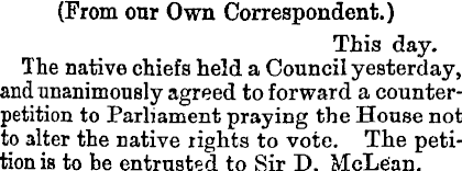 (From our Own Correspondent.) This day. The native chiefs held a Council yesterday, and unanimously agreed to forward a counterpetition to Parliament praying the House not to alter the native lights to vote. The petition is to be entrusted to Sir D. McLean.