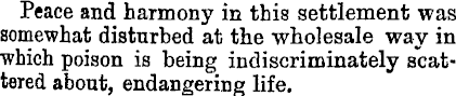 Peace and harmony in this settlement was somewhat disturbed at the wholesale way in ■which poison is being indiscriminately scattered about, endangering life.