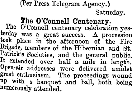 (Per Press Telegram Agency.) Saturday. The O'Connell Centenary. The O'Connell centenary celebration yesterday was a great success. A procession took place in the afternoon of the Eire Brigade, members of the Hibernian and St. Patrick's Societies, and the general public. It extended over half a mile in length. Open-air addresses were delivered amidst great enthusiasm. The proceedings wound up with s banquet and ball, both being numerously attended.