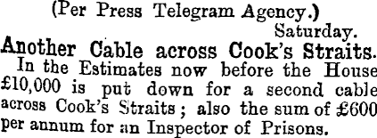 (Per Press Telegram Agency.) Saturday. Another Cable across Cook's Straits. ln the Estimates now before the House *10,000 is pnt down for a second cable across Cook's Straits; also the sum of £600 per annum for an Inspector of Prisons.