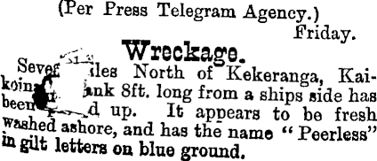 (Per Press Telegram Agency.) Friday. jv Wreckage. Ims BjF llea North of Kekeranga, Kaih?3m *? k Bft< lon 2 from a shi Ps Bide has wl^H?- 4 UP* Ifc aPPearß to be fresh X i aJ° re ' ai£ has the name " Peerless" ttgut letters on blue ground.