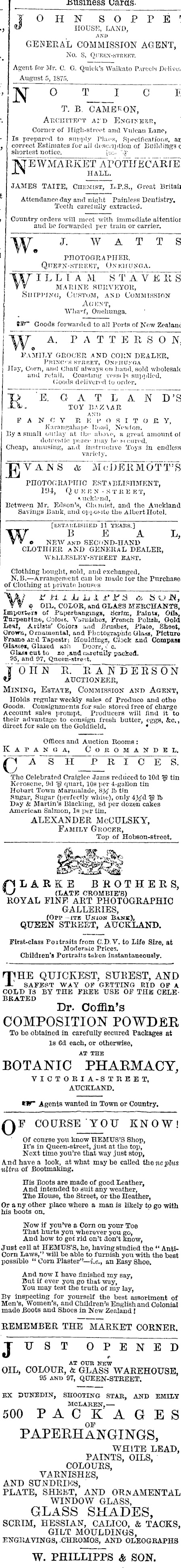 . Business Cards. JOHN SOPPED ~ W HOUSE, LAND, GENERAL COMMISSION AGENT, p NO. S, QUKKX-STRKET. Agent for Mr. C. G. Quick's Waikato Parcels Deliver August 5, 1875. [} N~° T I■ 0 • T. B. "CAMEFON, r. Architect aid Engi>eke, ', Corner of High-street and Vulcan Lane, Is prepared to supply riaos, Specifications, at' ~ correct Estimates for all description of Buildings rj shortest notice. [fioii^jl APOTHECARIES -i-^> HALL. JAMES TAITE, Chemist, L.P.S., Groat Britaii Attendance day and night. Painless Dentistry. Teeth carefully extracted. , Country orders will moot with immediate attention and be forwarded per train or carrier. , J. WATTS, 1 photographer, Qttern-strkt&t, Onkhunga. ILLIAM STAVJB RSj marine surveyor, Shipping, Custom, asd Commission' Agent, Wharf, Onehunga. SST" Goods forwarded to all Ports of Now Zealand WA. PATTERSON, family grocer and corn dealer, PHINCKS-BT.il BET, Oni'.IIUNOA Hay, Corn ; and Clialf always on band, sold wholesale and retail. Coasting vessels supplied. <«00(1r delivered to ordor. I.> E. G A T L A N D'S -»-&J- TOY BAZVAE AND FANCY R X l> O S I T O X V, Kuraugahapr- Eoad, Newton. By a small outlay at the above, a great amount of domestic peace may lie secured. Ciieap, amusing, ai.d instructive Toys in endless variety. TfIVAJNS <fc McDERMOTT'S PHOTOC RAPTITC EST A BLISHMENT, 1 !)4, QUEEN-ST It 15 ET, Auckland, Between Mr. Kdeon's, Chemist, and the Auckland Savings Bank, and opposite the Albert Hotel. [ESTABLISHED 11 YEAES.] WB E A L, o NEAV and SECOND-HAND CLOTHIER AND GENERAL DEALER, WJSLLESLEY-STBEET EAST. Clothing bought, Bold, and exchanged. N. B.—Arrangement can be made for the Purchase of Clothing at private, houses ■\A/ if ti. IJuLi i ±'if 3<% fc> U JN, V V * OIL, COLOR, and GLASS MSECHANTS, Imi)oirtor» of PaijerhansringK, Scrtn:, Palntu, OU», XurpentSae, Colois. Varulßhox, French Polish, Gold Lost, Arttata' Colors arid Bsrußhes, Plato, Sheet, Orowa, Oruumental, and Pbotoifraphic Glaita, Picture fraitia and Tapestr- Mouldings, Clock and Oompasi C+lasse*, Qlajsocl n3h Boors, (!■ c. Ghui« cat to zo ,an<l i».totuily pachod. 95, and 97, Qneen-strei-.t. "f~O"H N R. "eTaTnI) EESON : «/ AUCTIONEER, Mining, Estate, Comtviisriok and Agent, Holds regular weekly sales of Produce and othe Goods. Consignments for Halo stored free of charge Account sales prompt. Producers will find it to their advantage to consign fresh butter, eggs, &c., direct for sale on tho Goldileld. * Offices and Auction Rooms : KAVANGA,CO X O M A N D E L. A S H PRICES. The Celebrated Craiglee Jams reduced to lOd $ tin Kerosene, !)d ■$ quart, 10s per 4-gallon tin Hobart Town Marmalade, B>£ \h tin Sugar, Sugar (perfectly while), only 4J£d $ tt> Day & Martin's Blacking, 8d per dozen cakes American Salmon, Is per tin. ALEXANDER McGULSKY, Family Gkocer, Top of Hobson-street. OLARKB BROTHERS, (LATK CROMBIE'S) ROYAL FINE ART PHOTOGRAPHIC GALLERIES, (Opp -itb Uniok Bank), QUEEN STREET, AUCKLAND. First-class Poi traits from C.D.V. to Life Size, at Moderate Prices. Children's Portraits taken instantaneously. rFiHE QUICKEST, SUREST, AND JL1 SAFEST WAY OF GETTING RID OF A COLD IS BY THE FREE USE OF THK CELEBRATED Dr. Coffin's COMPOSITION POWDEE To be obtained in carefully secured Packages at Is 6d each, or otherwise, AT THE BOTANIC PHAKMACY, VICTORIA-STREET, AUCKLAND. HP" Agents wanted in Town or Country. QF COURSE YOU KNOW! Of course you know HEMUS'S Shop, It's in Queen-street, just at the top, Next time you're that way just stop, And have a look, at what maybe called thencphis ultra of Bootmaking. His Boots are made of good Leather, And intended to suit any weather, The Hoiise, the Street, or the Heather, Or a ny other place where a man is likely to go with his boots on. Now if you've a Corn on your Toe That hurts you wherever you go, And how to get rid on't don't know, Just csll at HEMUS'S, he, having studied the " AntiCorn Laws," will be able to furnish you with the best possible " Corn Plaster"—i.e., an Easy Shoe. And now I have finished my say, But if ever you go that way, You may test the truth of my lay, By inspecting for yourself the best assortment of Men's, Women's, and Children's English and Colonial made Boots and Shoes in New Zealand! REMEMBER THE MARKET CORNER. JUST OPENED AT OUR NEW OIL, COLOUR, & GLASS WAREHOUSE, 95 akt) 9T, QUEEN-STEEET. EX DTTNEDIN, SHOOTING STAR, AND EMILY MCLAREN.— 500 P A C X A GES OF PAPERHANGINGS, WHITE LEAD, PAINTS, OILS, COLOURS, VARNISHES, AND SUNDRIES, PLATE, SHEET, AND OTUNAMENTAL WINDOW GLASS, GLASS SHADES, SCRIM, HESSIAN, CALICO, & TACKS, | GILT MOULDINGS, ENGRAVINGS, .CHEOMOS, AND OLEOGEAPHS | W. PHILLIPPS & SON.