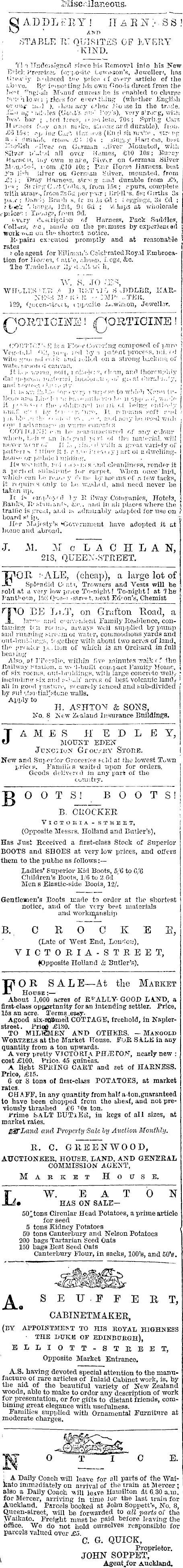 Miscellaneous. CjADDLEEY! HABNESS! *J ' A»D : STABLE REQUISITES OF EVERY ■KIND. Tha Undejsigned since his Kemoval into his New Biicl: PrMniKSS (opposite Lewisson's, Jewellerr, hn.s Urna'ly B'dnced tite piicn of every article of the sbove. By iniporting his own Goods direct from the best !"ngiisli Manufacturers he is enabled to charpc niuc-h lower j. rices for everything (whether English ; : orow*> Whke), lhan aoy other ifo.ise in the tr.-.de. liiding tadules (Gent's and Boy's), very s'-rorg, with .tit-si b»r piated trees, i.oniplete. 70s; Spring Cart Harness (my own make, strong and durable), from [ £3 15s; Spdiiij Cart .LJa,r/.ess (English BiaSe), strong j aaii durable from. £j iOs : iiuggy Haracsa, best ! Knsrllah i-iivei: on German Silver Mounted, wiili j Silvar plated all over Hames, £10 10s; Buggy Harness, my own make, Biivtr on German Silver Mounted, team £10 10s ; Pan- Bfoi-so Harness, best English 3iJ.?er ou Oorc.au Silver, mounted, from _18 ; Dray Harness, sfcrorg sad durable from £!>, 1(jb; SpringC-irfcOolla.-s, from]ss; J?purs, complete triiii Straps, from 3aGd per pv.r ; Bridles. ss; G-irths 3s pair ; Onnd>' Urnsli k. fr. mis Gd ; (..Gggings, 3s Cd ; r-tnc!: '. hotigs, 12ft, 9.-; Gci ; VI liips at wholesale : ThoDgß, from 9d. (i.vtry description of Harness, Tack Saddles, Collars, Ac , made on the premises by exponenteil ! work •■en on tli« shortest solice. j liipair;! executed promptly and at reasonable ' rates J s- ole agent for Eiliman's CoicbratedKoyal .Embrocation for Howes, (.Rlt'.o, Sheep. Dogs, &c. The T.-adchLienlly dealt, vrl'h, W. S. JONES, WHOLESALE AMD RKTAId .S...DDLBR, HAENESB M/.KKB. ■■■■ 3]MPO_TBR. 129, Queen-street, opposite iJewisson, JewelLir. PORTIOINS! (POE.TIGINE! . ! COHTIOIKE is a Floor Covering composed of puro ] Vegntubl'i Oil, prepared by a patent process, mixed j with groiind etirk. snd rolled on a strong biiolniic;1 ol' I watevproof cd canvas. Jt in v. warm, soft, noicelfss, clean, and thoroughly damp-proof material, inodorous, of great durability, and perfect t-laFtif-ity It in avnilbbV- for t-.vory pnrpoßO to which Kami tnlicon and linoleum have hitlicrlo bwn apx>iicd, v>'lii!c it ].r.'-3( s.'f-K tho additional luori'c of being eutiwly mmtfocUvi by imin.-r-.raluro. It remains soft :'.;;'( }<liii.bl(i iii 11,-f- col'U-Kt weather, and may bo used wiili ,: eqii"! advantage in warm ciimatES COTIC'IITE cm }>(■ manufactured of any colon"!1. which, ljdi!« an inirgral ]>in-t of the maicri.il, will never wear off. It, jk jumti d v/itb ;t great variety of patterns fittinr/ it for use i;i cv( ry j :it-t of a. dwellinghouse or ]<iibii<; building. Itn warmth, jioinkHFiifcß snd cleanliness, render it a perfect subbtimte for carpet. When onoo'lald, which can be re_cii.iy derm. by rneins of n few tacks, it j-i quires only to be washed, and need never be taken up. It i« employed by Esilway Companies, Hotel 3, 1 Banks. Restaurants, ice, ;md in ;Ui places where the j traliic iK mv,d, and is admirably adapted for use on J board ship. « Hor Miijf-sty'H Sjovernruent have adopted it at home and abroad. J. M. M cLACHLAN, 21S, QUEEN-STBEET. FOR -^ALE, (cheap), a large lot of Splendid CrcM, Trowsers and Vests will be sold at a vary low price To-night! To-night! at 7h& I'ant'ieon, 19S Que-n-street. »ext Edron's, Chemist. rpo BE LKT, on Grafton Road, a JL large and convfnient Family Residence, containing ten rooms, always well supplied by pump and ruuninp; stream of water, commodious yards and ont-baildings, together with about two acres of land, the greater portion of which i 3 an Orchard in full bearing Also, at Ellerelie, within five inimites Talk of the Railway station, v. vs-t^l-built compact Family Home, of six rooms. out-lmildingH, u?illi lai-ge concrete vrelSy I incimlin!.' six and a.lmlf acres of best volcanic land, | all In good pnstitre, Fi":eurc-ly fenced and tub-divided by snbsfantialjßtone walls. Apply to H. ASHTON & SONS, J-*o. 8 Is'tw Zealand Ijisurance Buildings. JAMES H ED L ET, MOUKT EDEN Jtjnciion Gf.ockky Store. I New and Superior Groceries ecld at the lowest Town ; prices. Families waited -apon for orders. Gcods delivered in any part of the Ojiuitry. BOOTS! BOOTS! B. CUOCKEE ViCTOItIA - STKEET, (Oxtposite Messrs. Holland and Butler's), Has Just Received a first-class Stock of Superior BOOTS and SHOES at very low prices, and offers them to the public as follows:— Ladies' Superior Kid Boots, 5/G to C/ 6 Children's Boots, 1/6 to _/0d Men s Elastic-side Boots, 12/. Gentlemen's Boots made to order at the shortest notice, and of the very beat materials a7ld workmanship. B. C R O C X E B, (Late of West End, Lonriou), VICTORIA-ST RE E T, (Opposite Holland & Butler's). FOR SALE—At the Market House :— About 1,000 acres of REALLY- GOOD lA2TD, a first-class opßortnaity for an intending settler. Price, 15s an acre. Terms .ewy. Agood six-Dimmed COTTAGE, freehold, in Napierstreet. Prloi* £IHO. TO MILTOIEN AND OTHERS. — Makqold Wortzels at the Market Rouse. FuR SA.LK in any quantity from a ton upwards. A very pretty VICTORIA. PHyEUOK, nearly new : cost £100. Price. 45 guineas. A light SPUING CART and set of HARNESS. Prico, £15. 6 or 8 tons of firsc-class POTATOES, at market rates. CHAFF, in any quantity from half a-ton, guaranteed to have been chopped from tho she.*f, and not previously thrashed £6 10s ton. Prime SALT LUTiEiI, in kegs of all sizes, at market rates. BSTLand and Property Sale hy Auction Monthly. R. C. GREENWOOD, auctioneer, house, land, and general commission agent, Market House. LW. EATON • HAS ON SALEDO^ tons Circular Head Potatoes, a prime article for seed i 5 tons Kidney Potatoes 50 tons Canterbury and Nelson Potatoes 200 bags Tartarian Seed Oats 150 bags Best Seed Oats Canterbury Flour, in sacks, 100's, and 50'e. SEUFEERT, CABINETMAKER, (EY APPOINTMENT TO HIS ROYAL HIGHNESS : THE DUKK OF EDINBURGH), ELLIOTT-STREET, Opposite Market Entrance. i A.S. having devoted special attention to the manufacture of