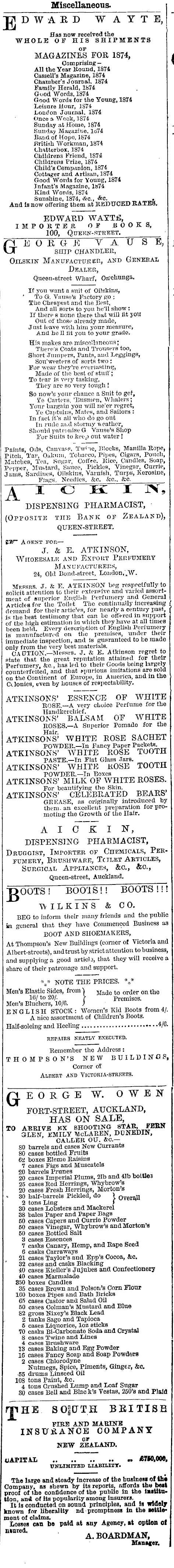 Miscellaneous. TJDW'AED W AYT E, Has now received the WHOLE OF HIS SHIPMENTS MAGAZINES FOR 1874, i Comprising — " All the Year Round, 1874 Cassell's Magazine, 1874 Chamber's Journal, 1874 Family Herald, 1874 Good Words. 1874 Good Words for the Young, 1874 Leisure Hour, 1574 London Journal, 1874 Once a Weok, 1574 Sunday at Home, J 874 Sunday Magazine. Iti7<4 Band: of Hope, 1874 British Workman, 1874 Chatterbox, 1874 Childrens Friend, 1574 Childrens Prize, 1874, Child's Companion, 1874 Cottager and Artisan, 1874 Good Words for Young, 1874 Infant's Magazine, 1874 Kind Words, 1874 Sunshine, 1874, &c, &c. . And is now offering them at REDUCED KATES. EDWARD WAYTiS, IMPOKTIR OF BOOKS, 100, Queen-street. EOB, G E V A U S E, j ship chandler, Oilskin Manufactured, and General Dealer, Queen-street Wharf, Otfehunga. If you want a suit of Oilskins, ' To G. Vause's Factory go ; The Cheapest and the Best, And all sorts to you he'll show: If there 8 nono there that will lit you Out of those already made, Just leave with him your measure, And ho 11 lit you to your grade. His makes arp misco'lnneourc; There's Coats and Trousers too, , Short Jumpers, Ptmtß, and Leggings, Sou'westers of sorts two : For wear they're everlasting, Made of the best of stuff; To tear is very tasking, They are so very tough ! So how's your chance a Suit to get, Sfe Carters, 'Busmen, Whalers; Your bargain you will ne'er regret, Ye Captains, Mates, and Sailors : In fact it's all who do go out In rude and stormy weather, Should patronise G. Vause's Shop For Suits to keep out water ! Paints, Oils, Canvass, Twine, Blocks, Manilla Rope, Pitch, Tar, Oakum, Tobacco, Pipes, Cigars, Pouch, Matches Tea, Sugar, Coffee, Kice, Candles, Soap, Pepper, Mustard, Sauce, Pickles, Vinegar, Currie, Jams, Sardines, Oilskins, Varnish, Turps, Kerosiue, Flags Needles, kc. &c. fee. DISPENSING PHARMACIST, ■ (Opposite the Bank of Zealand), queen-street. EW~ Agent for — J. & E. ATKINSON, WIIOEESALK AND EXPORT PERFUMERY Manufacturers, 24, Old Bond-street, London^W. Messrs. J. k E. ATKINSON beg respectfully to solicit attention to their extensive and varied assortment of superior English Perfumery and General Articles for the Toilet. The continually increasing { demand for their articles, for nearly a century past, is the best testimony that can be offered in support of the high estimation in which they have at all Units been held. Every description of English Perfumery is manufactured on the premises, under their immediate inspection, and is guaranteed to be raado only from the very best materials. CAUTION.—Messrs. J. k E. Atkinson regret to state that the great reputation attained for their Perfumery, &c, has led to their Goods being largely counterfeited, and that spurious imitations are sold on the Continent of Europe, in America, and in the Ctlonies, even by houses of respectability. ATKINSONS' ESSENCE OF WHITE ROSE.—A very choice Perfume for the Handkerchief. ~ ATKINSONS' BALSAM OF WHITE ROSES.—A Superior Pomade for the ATKINSON s'' WHITE ROSE SACHET POWDER.—In Fancy Paper Packets. ATKINSONS' WHITE ROSE TOOTH PASTE.—In Flat Glass Jars. ATKINSONS' WHITE ROSE TOOTH POWDER.—In Boxes ATKINSONS' MILK OF WHITE ROSES. For beautifying the Skin. ATKINSONS' CELEBRATED BEARS' GREASE, as originally introduced by them, an excellent preparation for promoting the Growth of the Hair. A I G~K I N, DISPENSING PHARMACIST, Druggist, Importer of Chemicals, Perfumery, Brushware, Tcjlet Articles, Surgical Appliances, &c, &c, Queen-street, Auckland. T>OOTS ! BOO'IS!! BOOTS 1!! WI L X INS & CO. BEG to inform their many friends and the public ki general that they have Commenced Business as BOOT AND SHOEMAKERS, At Thompson's New Buildings (comer of Victoria and Albert-streets), and trust by strict attention to business, and supplying a good article, that they will receive a share of their patronage and support. V s NOTE THE PRICES. V Men's Elastic Sides, from") Made to or( i er on the 16/ to 20/. \ ' premises. Men's Bluchers, 10/6. ) ENGLISH STOCK : Women's Kid Boots from 4/. A nice assortment of Children's Boots. Half-soleing and Heeling 4/(5. REPAIRS NEATLY EXECUTED. Remember the Address: THOMPSON'S NEW BUILDINGS, Corner of Albert and Victoria-streets. r\ eorgbl owen FORT-STREET, AUCKLAND, HAS ON SALE, TO ARRIVE XX SHOOTING STAR, FERN 3LEN KMILY McLAREN, DDNEDIN, CALLER OTJ. &C— 80 barrels and cases New Currants 80 cases bottled Fruits 62 boxes Eleme Raisins 7 cases Figs and Muscatels 20 barrels Prunes 20 cases Imperial Plums, 21b and 41b botUe3 25 cases Red Herrings, Whybrow's 20 cases Fresh Herrings, Morton's 30 half-barrels Pickled, do > overaJQ 2 tons Ling J 30 cases Lobsters and Mackerel 38 bales Paper and Paper Bags 60 cases Capers and Currie Powder 50 cases Vinegar, Whybrow's and Morton's 50 cases Bottled Salt 3 cases Essences 1 casks Canary, Hemp, and Rape Seed 6 casks Carraways 21 cases Taylor's and Epp's Cocoa, &o. ' 32 cases and casks Blacking 40 cases Kiellers Jujubes and Confectionery 40 cases Marmalade 850 boxes Candles 35 cases Brqwn and Poison's Corn Flour IGO boxes Pipes and Bath Bricks 65 cases Castor and Salad Oil 60 cases Colman's Mustard and Blue 82 gross Nixey's Black Lead 2 tanks Sago and Tapioca 5 cases Liquorice, loz sticks 70 casks Bi-Carbonate Soda and Crystal 8 cases Twine and Lines 4 cases Brushware 13 cases Baking and Egg Powder 16 cases Fancy Soap and Soap Powdws 2 cases Chlorodyne Nutmegs, Spice, Piments, Ginger, &o. <55 drums Linseed Oil 108 tons Paint, &c. 4 tons Crushed Lump and Loaf Sugar 30 cases Bell and Black's Vestas, 250's and Plaid HpHE SOgCTTH BBITISH FIRE AND MARINE INSURANCE COMPANY NEW ZEALAND. WAPITAX .. .. .. .. » J17M.006, UNLIMITED LIABILITY. The large and steady increase of the buslnew of thi Company, as shewn by its reports, affords thu beat proof of the confidence of the public in the institution, and of its popularity among insurers. It is conducted on sound principles, and is widely known for liberality 
