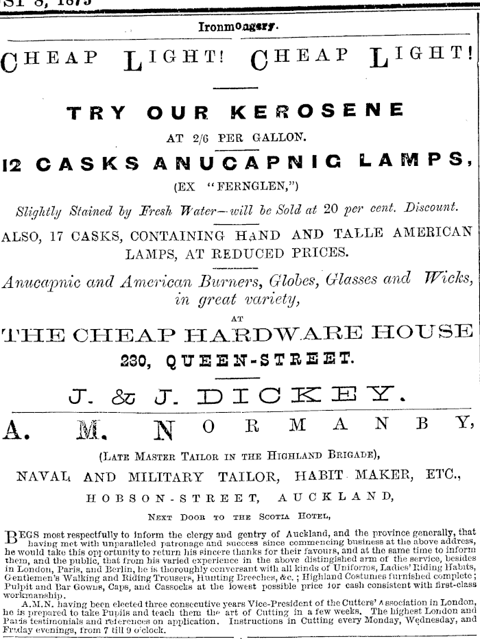 Ironmoogsr jr. QHEAP LIGHT! QHEAP J, IGH T ! TRY OUR KEROSENE AT 2/6 PER GALLON. 12 CASKS AN UC A PNIG L A _¥I PS , (EX "FERNGLEN,") BligUly Stained ly Fresh Water-will he Sold at 20 per cent. Discount. ALSO, 17 CASKS, CONTAINING HAND AND TALLE AMEEICAN LAMPS, AT REDUCED PRICES. Anucapnic and American Burners, Globes, Glasses and Wiclcs, in great variety, AT THE CHEAP HAEDWARE HOUSE 230, QTJEE IT-STREET. vJ. So J". DICKEY. A^ AL N~~°~~^ ** A N B *' (Late Mastkb Tailor in the Highland Brigade), NAVAL. AND MILITARY TAILOR, HABIT MAKER, ETC., HOBSON-STREET, AUCKLAND, Next Doob to the Scotia Hotel, T) EGS most respectfully to Inform the clergy aai gentry of Auckland, and the province generally, that -LJ having met with unparalleled patronage and success since commencing business at the above address, he would take this opportunity to return his sincere thanks for their favours, and at the same time to inform them, and the public, that from his varied experience in the above distingished arm of the service, besides in London, Paris, and Berlin, he is thoroughly conversant with all kinds of Uniforms, Ladies' Elding Habits, Gentlemen's "Walking and Hiding Trousers, Hunting Breeches, <tc.; Highland Costumes furnished complete; Pulpit and Bar Gowns, Caps, and Cassocks at the lowest possible price for cash consistent with first-class workmanship. A.M.N. having been elected three consecutive years Vice-President of the Cutters' A ssociation in London, he is prepared to take Pupils and teach them the art of Cutting in a few weeks. The highest London and Paids testimonials and references on application. Instructions in Cutting every Monday, Wednesday, and Fri.day evenings, from 7 till 9 o'clock.