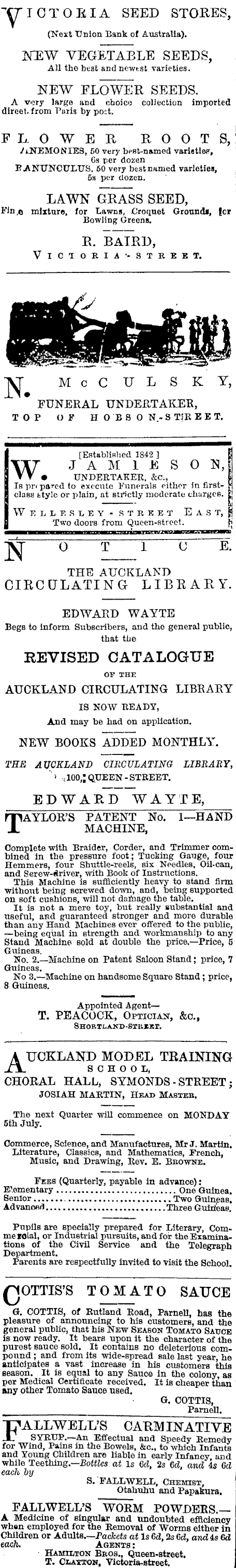 -yiCTOEIA SEED STORES, (Next Union Bank of Australia). NEW VEGETABLE SEEDS, All the bust and newest varieties. NEW FLOWER SEEDS. A very large and choice collection imported direct. from Paris by post. FLOWER ROOTS, VINEMONIES, 50 very best-named varieties, Cs per dozen RANUNCULUS. 60 very best named varieties, 5a per dozen. LAWN GRASS SEED, Fin,e mixture, for Lawns, Croquet Grounds, |cr Bowling Greens. R. BAIRD, Victoria --street. IVJ McCULSKY, ! FUNERAL UNDERTAKER, TOP OF H0880N..8 TIR EE T. ■■■■■■■■■■^■^■■'^■■^■■'^^ [Established 1842 ] WJAMIESON, • UNDERTAKER. &C, i Is pri pared to execute Funerals either in first- " class fctyle or plain, at strictly moderate charges. J !. WELLE SL E V - STR KB T EAS T, jjj Two doors from Queen-street. j| "XT O T 1 C E. THE AUCKLAND CIRCULATING LIBRARY. _____ EDWARD WAYTE Begs to inform Subscribers, and the general public, that the REVISED CATALOGUE OF THE AUCKLAND CIRCULATING LIBRARY IS NOW READY, And may be had on application. NEW BOOKS ADDED MONTHLY. THE AUCKLAND CIRCULATING LIBRARY, "> -, 100,1 QUEEN -STREET. EDWARD WAYTE, AYLOR'S PATENT No. I—HAND MACHINE, Complete with Braider, Corder, and Trimmer combined in the pressure foot; Tucking Gauge, four Hemmers, four Shuttle-reels, six Needles, Oil-can, and Serew-elriver, with Book of Instructions. This Machine is sufficiently heavy to stand firm without being Bcrewed down, and, being supported on soft cushions, will not damage the table. It is not a mere toy, but really substantial and useful, and guaranteed stronger and more durable than any Hand Machines ever offered to the public, —being equal in strength and workmanship to any Stand Machine Bold at double the price.—Price, 5 Guineas. No. 2.—Machine on Patent Saloon Stand; price, 7 Guineas. No 3. —Machine on handsome Square Stand; price, 8 Guineas. Appointed Agent— T. PEACOCK, Optician, &c, Shortland-sthekt. A UCKLAND MODEL TRAINING _TL school, CHORAL HALL, SYMONDS - STREET; JOSIAH MARTIN, Head Masteb. The next Quarter will commence on MONDAY sth July. Commerce, Science, and Manufactures, Mr J. Martin. Literature, Classics, and Mathematics, French, Music, and Drawing, Rev. E. Bkowne. Fees (Quarterly, payable in advance): Elementary One Guinea. Senior Two Guineas. Ad vanofld Three Guinteas. Pupils are specially prepared for Literary, Comme roial, or Industrial pursuits, and for the Examinations of the Civil Service and the Telegraph Department. Parents are respectfully invited to visit the School. QOTTIS'S TOMATO SAUCE G. COTTIS, of Rutland Road, ParneU, has the pleasure of announcing to his customers, and the general public, that his New Season Tomato Sauce is now ready. It bears upon it the character of the purest sauce sold. It contains no deleterious compound ; and from its wide-spread sale last year, he anticipates a vast increase in his customers this season. It is equal to any Sauce in the colony as per Medical Certificate received. It is cheaper than any other Tomato Sauce used. G. COTTIS, ParneU. ■pALLWELL'S CARMINATIVE X SYRUP.—An Effectual and Speedy Remedy for Wind, Pains in the Bowels, &c, to which Infants and Young Children are liable in early Infancy and while Teething.— Bottles at Is 6cl, 2s 6c?, and is Gd each by S.'FALLWELL, Chemist, Otahuhu and Papakura. FALLWELL'S WORM POWDERS.— A Medicine of singular and undoubted efficiency wh«n employed for the Removal of Worms either in Children or Adults.— Packets at lsGd, 2s 6d, and is 6d each. Agents : Hamilton Bbos., Queen-street. T. Clayton, Victoria-street.