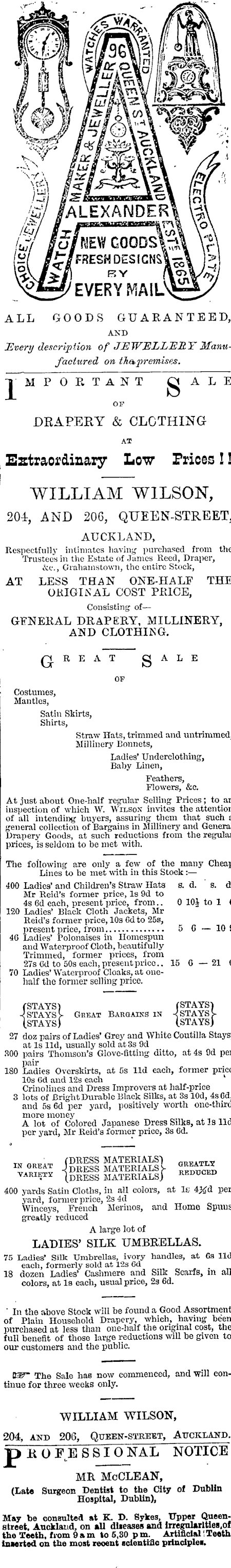 /&y /alexanderi vjv £f /o/newgoods\^l \j\ s( /</ FRESH DES(GNS\co\ )5 ALL GOODS GUARANTEED, I AND ' Every description of JEWELLERY Manufactured on the*premises. "pM POItT AN T OA L E or DEAPERY & CLOTHING AT Extraordinary Low Prices!! WILLIAM WILSON, 204, AND 206, QUEEN-STREET, AUCKLAND, Respectfully intimates having purchased from the Trustees in the Estate of James Reed, Draper, &c, Grahamstown, the entire Stock, AT LESS THAN ONE-HALF THE ORIGINAL COST PRICE, Consisting of— GFNERAL DRAPERY, MILLINERY, AND CLOTHING. Q.REAT Q A L E OF Costumes, Mantles, Satin Skirts, Shirts, Straw Hats, trimmed and untriinmed, Millinery Bonnets, Ladies' Underclothing, Baby Linen, Feathers, Flowers, &c. At just about One-half regular Soiling Prices; to an inspection of which W. Wilson invites the attention of all intending buyers, assuring them that such a general collection of Bargains in Milliner}' and General Drapery Goods, at such reductions from the regular prices, is seldom to be met with. The following are only a few of the many Cheap Lines to be met with in this Stock: — 400 Ladies' and Children's Straw Hats s. d. s. d. Mr Reid's former price, Is 9d to 4s 6d each, present price, from.. 0 10J to 1 £ 120 Ladies' Black Cloth Jackets, Mr Reid's former price, 10s Cdto 255, present price, from 5 6 — 10 £ 46 Ladies' Polonaises in Homespun and Waterproof Cloth, beautifully Trimmed, former prices, from 27s Cd to 50s each, present price.. 15 6—21 C 70 Ladies' Waterproof Cloaks, at onehalf the former selling price. (STAYS) (STAYS) -(STAYS y Gkeat Bargains in < STAYS y (.STAYS) (STAYS) 27 doz pairs of Ladies' Grey ana White Coutilla Stays, at Is lid, usually sold at 3s 9d 300 pairs Thomson's Glove-fitting ditto, at 4s 9d per pair 180 Ladies Overskirts, at Gs lid each, former price 10s 6d and 12s each Crinolines and Dress Improvers at half-price 3 lots of Bright Durable Black Silks, at 3s lOd, 4s 6d, and 5s 6d per yard, positively worth one-third more money A lot of Colored Japanese Dress Silks, at Is lid per j'ard, Mr Reid's former price, 3s 6d. IN GREAT iSggJStSSfI ™« varied jgsigtSSS; *~d 400 yards Satin Cloths, in all colors, at Is; 4^d per yard, former price, 2s 4d Winceys, French Merinos, and Home Spuus greatly reduced A large lot of LADIES' SILK UMBRELLAS. 75 Ladies' Silk Umbrellas, ivory handles, at Ga lid each, formerly sold at 12s 6d 18 dozen Ladies' Cashmere and Silk Scarfs, m all colors, at Is each, usual price, 2s 6d. " In the above Stock will be found a Good Assortment of Plain Household Drapery, which, having been purchased at less than one-half the original cost, the full benefit of those large reductions will be given to our customers and the public. £®~ The Sale has now commenced, and will continue for three weeks only. WILLIAM WILSON, ■ 204, AND 206, QUEEN-STREBT, AITCKXAND. BKOFESSIO NAL NOTICE MR McCLEAN, (Late Surgeon Dentist to the City of Dublin Hospital, Dublin), May be consulted at K. D. Sykes, Upper Queenstreet, Auckland, on all diseases and Irregularities, of the Teeth, fiom 9am to 6,30 pm. Artificial! Teeth inserted on the most recent scientific principles.