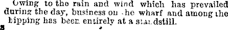 Owing to tho rain and wind which has prevailed during the day, business on 'he wharf and among the hipping has beer, entirely at a standstill.