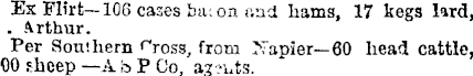 Ex Flirt—lo6 cases bacon v.ni hams, 17 kegs lard, . Arthur. Per Southern <^ross, from Napier— 60 head cattle, 00 sheep —A b P Co, agoats.
