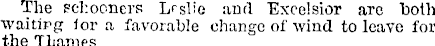 The schooners Lrslie and Excelsior are both waiting for a favorable change of wind to leave for the Thamps