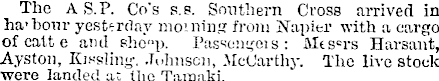The A S.P. Go's s.s. Southern Cross arrived in ha'bour yesterday morning from Napier with a cargo of catt c and ehofip. Passengers : Messrs Harsant, Ayston, Kissliny. Johnson, McCarthy. The live stock were landed a: the Taraaki.