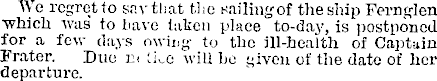 We regret to saytbat the sailingof the ship Fern glen ■which was to iia\-e taken place to-day, is postponed for a few days owing to the ill-health of Captuin Frater. Due notice will be given of the date of her departure.