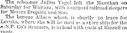 The schooner Julius Vogel left the Manukau on Saturday for Waitara, with a cargo of railroad sleepers for Messrs Brogden and Son. The barque Albion which is shortly to leave for Levuka, where she will be used as a store shfp for the a .S.P. Go's steamers, is io load with coals at Russell en route.