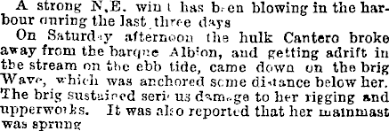 A strong jsr.E. win t has b.-:en blowing in the harbour during the last three days On Saturday afternoon the hulk Cantero broke away from the barque Albion, and getting adrift in the stream on the ebb tide, came down on the brig Wave, which was anchored seme di-itance below her. The brig sustained seri< us dinv.ge to bur rigging and upperwoiJjs. It was also reported that her mainmast was sprang