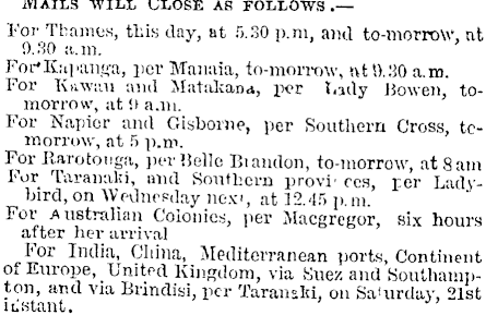Mails will Close as follows .— For Thames, this day, at 5.30 p.m. and to-morrow, at 0.30 a.m. , FofKapanga, per Manaia, to-morrow, nt \).SO a.m. For Ka-wan and Matakana, per Lady Bowen, tomorrow, at i» a.m. For Napier and Gisborne, per Southern Cross, tomorrow, at 5 p.m. For Rarotouga, per Helle Brandon, to-morrow, at 8 am For Taranaki, mid Southern provi' res, per Ladybird, on Wednesday nexi, at 12.45 p.m. For Australian Colonies, per Macgregor, six hours after her arrival For India, China, Mediterranean ports, Continent of Europe, United Kingdom, via Suez and Southampton, and via Brindisi, per Taranaki, on Saturday, 21st liistant.